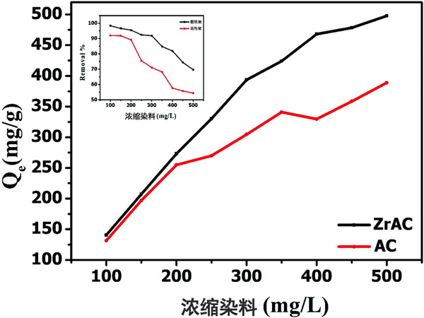 吸附等溫線 已經(jīng)進(jìn)行了初步的批處理實驗,以研究新制備的載鋯活性炭的性能并確定其在廢水處理中的可行性。使用活性炭和載鋯活性炭的染料吸附如圖3所示。該圖顯示,隨著濃度從100 mg L -1增加到500 mg L -1,載鋯活性炭對活性藍(lán)19染料的去除效率更高。同樣,載鋯活性炭的吸附容量也顯示出比活性炭大吸附容量。載鋯活性炭的去除效率和吸附能力的提高主要?dú)w因于較高的氧化功能,該功能很容易從溶液中吸收染料分子。