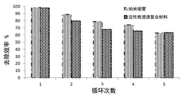活性炭復(fù)合材料的再生具有經(jīng)濟(jì)重要性。該實(shí)驗(yàn)涉及許多吸附-解吸循環(huán),以估計(jì)重復(fù)脫色對(duì)納米材料吸附效率的影響。發(fā)現(xiàn)納米碳管和活性炭浸漬材料對(duì)活性紅的去除效率略有變化,如圖3所示。數(shù)據(jù)顯示原始納米碳管和活性炭浸漬材料存在差異與不同初始活性紅染料濃度下重復(fù)使用的納米化合物相比。活性紅的吸收程度在第一個(gè)循環(huán)后達(dá)到98.18%,然后在五輪納米碳管后降低到62.72%,而對(duì)于活性炭浸漬材料,第一個(gè)循環(huán)去除效率為97.72%,在第一個(gè)循環(huán)后,在五輪后降低到63.18%,表明其再生有效性,如圖3所示。因此,可以得出結(jié)論,納米碳管和活性炭浸漬材料的吸附過(guò)程會(huì)受到延長(zhǎng)重復(fù)使用周期的影響,而不會(huì)損失大量染料吸附能力。因此,兩種納米化合物被多次用于從水性階段去除活性紅染料。因此,這表明它們可以多次使用,證明了它們的經(jīng)濟(jì)可行性。