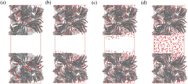 活性炭由微孔和介孔組成,介孔在一定程度上影響吸附特性。因此,研究芳烴在具有分級孔的活性炭上的吸附特性,以明確介孔對下一節(jié)吸附特性的影響。在這些模擬中,選擇了密度為0.8g/cm3的微孔活性炭,不同樣品的中孔尺寸分別選擇為2.0、2.5、3.0和4.0nm。具有不同層次孔隙的活性炭。分層孔隙活性炭模型構(gòu)建為密度在0.6-0.7g/cm3的合理范圍內(nèi)。圖3展示了苯分子在p=10kPa下具有不同中尺度孔徑的活性炭上的吸附位點分布。這表明即使在p=10kPa時,苯的吸附也僅發(fā)生在介孔表面,而不會填充介孔的空隙空間。圖4說明了對二甲苯在具有3.0nm孔的活性炭上從低壓到高壓的吸附位點的變化。從圖4(a)-(d)可以看出,只有微量的對二甲苯分子被吸附到微孔上,當(dāng)壓力為1.25kPa時,微孔逐漸被填滿,中孔壁上出現(xiàn)吸附位點。當(dāng)壓力增加到3.75kPa時,吸附位點增加,介孔中開始出現(xiàn)多層吸附,最終介孔充滿對二甲苯,此時壓力可達6.25kPa。