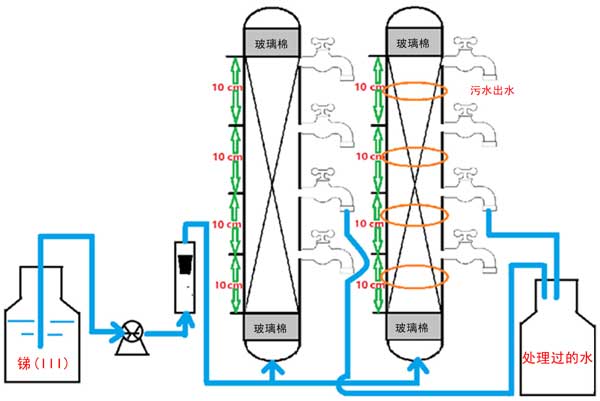 我們進(jìn)行了色譜柱實驗,以了解弱磁場是否可用于提高連續(xù)流動系統(tǒng)中納米級零價鐵的反應(yīng)性。設(shè)置了兩個平行的連續(xù)柱系統(tǒng),內(nèi)徑為10mm(外徑=14mm),高度為200mm,如圖1所示。一個柱系統(tǒng)有一系列環(huán)形永磁體,最大磁場通量強(qiáng)度約為1800Gs(材料:釹鐵硼),每5.0厘米放置一個環(huán)形磁鐵。聚甲基丙烯酸甲酯柱填充有10g鐵與活性炭(10-20目)的混合物。柱的兩端用一小塊玻璃棉塞住。圖1描述了色譜柱組件和與之配套的實驗設(shè)計。測試是在25±1℃下完成的。為了獲得合適的流速,使用了蠕動泵。銻(III)離子溶液通過鐵改性活性炭床向上轉(zhuǎn)移,以確保床完全飽和。為了評估銻(III)吸附去除情況,定期采集流出物樣品。