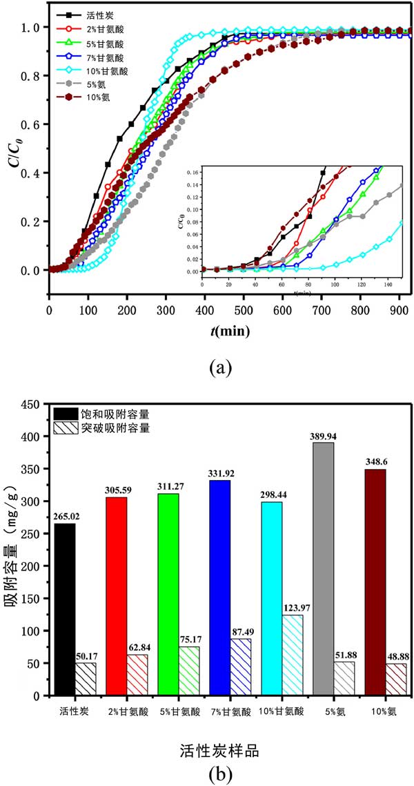 測試了選定的甲苯VOC對活性炭的吸附性能。在每個(gè)實(shí)驗(yàn)運(yùn)行中,甲苯通過裝有活性炭的吸附管直到達(dá)到平衡,即活性炭吸附劑被甲苯飽和。圖2(a)所示的穿透曲線呈現(xiàn)為甲苯吸附量吸附(ç/ç0)與接觸時(shí)間(噸,分鐘)六種的活性炭正在進(jìn)行中,它們的飽和和突破吸附容量如圖2所示(b)。從吸附曲線可以看出,甘氨酸修飾的活性炭的穿透時(shí)間明顯延長,而飽和氨改性活性炭的時(shí)間延長;钚蕴可霞妆酱┩肝侥芰Φ捻樞?yàn)?0%甘氨酸改性活性炭>7%>5%>2%>5%氨改性活性炭>未改性活性炭>10%氨改性活性炭,而活性炭對甲苯飽和吸附容量的順序如下:5%氨改性>10%>7%甘氨酸改性>5%>2%>10%>未改性活性炭?梢姼拾彼嵝揎棇妆轿接酗@著的正向影響。與原來的AC相比,甘氨酸改性的活性炭對甲苯的突破吸附能力分別提高了25%、50%、74%和147%,隨著甘氨酸濃度的增加呈上升趨勢。同時(shí),甘氨酸改性的活性炭對甲苯的飽和吸附容量分別增加了15%、17%、25%和13%,且隨著甘氨酸濃度的增加先增加后減少。5%和10%的氨改性也提高了甲苯的吸附性能,但其優(yōu)勢主要體現(xiàn)在飽和吸附容量上,與原來的活性炭相比,分別提高了47%和32%。