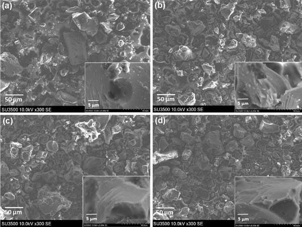 圖1:活性炭的SEM圖像(a)炭化料(b-d)不同活化方式制成的活性炭。