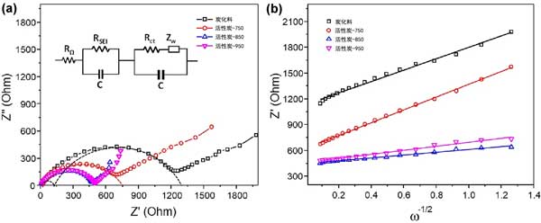 圖2:a電化學(xué)阻抗譜,b是阻抗與炭化料和活性炭角頻率平方根倒數(shù)之間的線性關(guān)系。