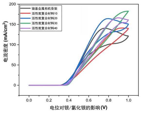 通過在KOH和CH3OH中氧化甲醇,使用循環(huán)伏安法測試活性炭復(fù)合材料的電化學(xué)性能。具有活性炭復(fù)合材料的鎳金屬對甲醇氧化反應(yīng)表現(xiàn)出更高的催化活性(見圖2)。在鎳金屬改性玻璃碳電極的情況下,峰值電流密度沒有添加活性炭的高。具有更高濃度活性炭(40mg)的樣品顯示出高峰值電流密度。隨著活性炭量(60mg)的進(jìn)一步增加,峰值電流密度降會稍微降低。綜上所述,建議將活性炭的濃度增加到一定限度可以提高電流密度。然而,增加活性炭的濃度也可能對催化活性產(chǎn)生不良后果。此外,活性炭復(fù)合材料的CV曲線具有不同的形狀和峰位置,這是因?yàn)楹铣蓵r活性炭分散不完全,也由于其大量使用導(dǎo)致催化劑發(fā)生簇集,導(dǎo)致覆蓋金屬有機(jī)框架表面,從而阻礙活性催化位點(diǎn)在低電位下進(jìn)行反應(yīng),從而在高電位下發(fā)生電荷轉(zhuǎn)移。