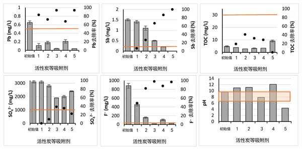 圖2:活性炭等吸附劑的篩選。廢水中污染物的數(shù)量顯示在主y軸上的列中,污染物減少量顯示為次要y軸上的黑點(diǎn)。橙色線(xiàn)是水道排放的限值。
