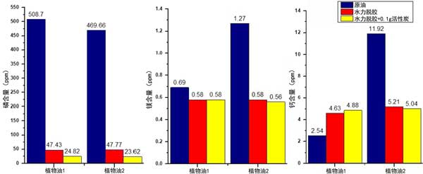 磷含量在兩個(gè)兩種植物油中主要由以所示的處理(水重量2%+活性炭0.1克)后減少圖2。植物油1的磷含量降低了大約95.22%,而植物油2的磷含量降低了大約相同的值(94.98%)。油液經(jīng)水脫膠后Mg、Ca含量略有下降,而Ca處理后略有升高。這一結(jié)果可能是由于在處理過程中活性炭中存在一些Ca解離回油相;钚蕴繉(duì)磷含量的大量降低是由于NaOH改性的活性炭具有極性、帶正電荷的表面。由于存在芳環(huán)簇和固有缺陷,它還具有磁力。在脫膠過程中將活性炭添加到植物油和水中時(shí),活性炭的芳環(huán)簇中的離域電子產(chǎn)生磁矩,強(qiáng)烈誘導(dǎo)磷脂磷酸頭部周圍的順磁性氧。同時(shí),活性炭的極性/親水性也允許與極性水分子相互作用。水分子也被磁場激活,從而發(fā)生氫自旋從旁水到鄰水的重新定向,從而降低水的抗磁性;钚蕴空T導(dǎo)的這種磁場會(huì)導(dǎo)致表面張力降低,削弱水分子的分子內(nèi)能。結(jié)果,更多的水分子被分解成H+離子和OH-離子,促進(jìn)更多水解反應(yīng)。這些現(xiàn)象與其他力量相結(jié)合:熱能和離心也會(huì)引發(fā)磷脂分子內(nèi)的鍵斷裂,導(dǎo)致磷酸頭部基團(tuán)從磷脂分子上分離(脫磷脂)。