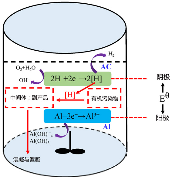 根據(jù)實際工況,提出了一種可行的活性炭載鋁微電解工藝分解水生環(huán)境中有機污染物的反應機理(圖2)。由于其高吸附容量和電導率,活性炭被用作陰極保護。在陽極(鋁廢料),由鋁提供的電子通過微型原電池轉移到陰極(活性炭),吸附在陰極表面的有機污染物受到這些釋放的電子的攻擊。水電離產(chǎn)生的H+在陰極獲得電子并產(chǎn)生具有強化學反應性的活性氫[H]或H2,和活性氫[H]·可以部分降解有機污染物。此外,Al失去三個電子形成鋁離子(Al3+)。然后,鋁離子沉淀形成氫氧化鋁(Al(OH)3、Al(OH)-4等)。作為有利的絮凝劑,這些氫氧化鋁可以有效去除廢水中的有機污染物。難降解污染物在活性炭載鋁微電解工藝的輔助下被分解為小分子中間體,也可以通過氫氧化鋁絮狀污泥的絮凝共沉淀來消除。換言之,與活性炭載鋁微電解工藝相關的許多協(xié)同效應可以有效地分解水環(huán)境中的有機污染物。