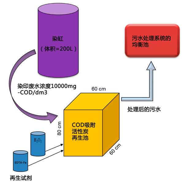 活性炭吸附處理高COD染色廢水,研究中使用5g活性炭從60mL分散的富含染料的廢水中吸附50-60%的COD。所用活性炭的吸附容量約為0.165g-COD/g-活性炭。在使用活性炭進(jìn)行COD吸附操作期間,無需調(diào)整pH或溫度。總體而言,使用活性炭吸附濃縮印染廢水的COD,其次是乙二胺四乙酸鐵鈉催化,飽和活性炭的過氧化物氧化處理可能是去除高COD染色廢水的有前景的替代方案,其氧化劑更少,COD處理效率更高。并且提出了一個按比例放大的200L吸附-再生裝置,并解決了其操作過程和潛在限制。