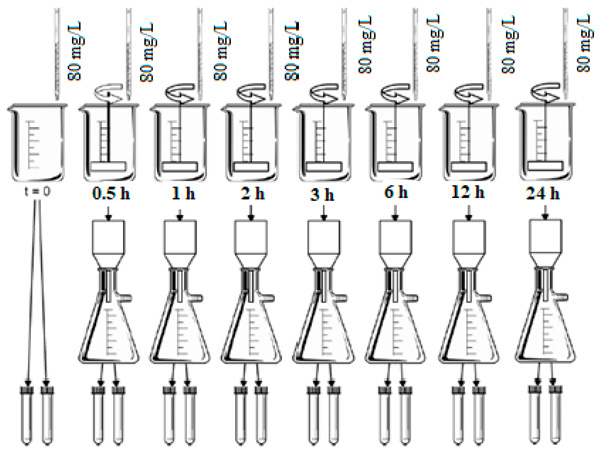 測定平衡時間的吸附試驗(yàn)對每種活性炭進(jìn)行兩次。使用了7個裝有500mL研究水的1L燒杯。每個燒杯接受一份活性炭懸浮液,以在水研究中獲得80mg/L的初始濃度。將燒杯放在一個罐子測試設(shè)備中,將混合速度保持在205rpm在恒溫23℃的環(huán)境中。采用的接觸時間為0.5、1、2、3、6、12和24小時。接觸時間后,將每個燒杯從攪拌中取出,立即通過孔徑為0.22μm的纖維素酯膜過濾研究水,以分離碳并中斷吸附過程。分析過濾后的水餾分的pH值和柱狀藻紅濃度。圖1顯示了平衡時間測定分析中評估的條件的示意圖。
