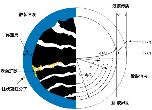 在第一實(shí)驗(yàn)階段獲得的吸附平衡測試的實(shí)驗(yàn)數(shù)據(jù)適合等溫線模型Langmuir、Freundlich和Redlich-Peterson。將最適合吸附平衡數(shù)據(jù)的等溫線模型的參數(shù)值應(yīng)用于HSDM模型,以模擬SBA柱中的吸附過程。該模型考慮了發(fā)生在兩個連續(xù)擴(kuò)散步驟中的吸附過程,即:通過活性炭顆粒周圍的固定流體層擴(kuò)散(膜擴(kuò)散)和通過活性炭內(nèi)部孔的擴(kuò)散(表面擴(kuò)散),如圖2所示。