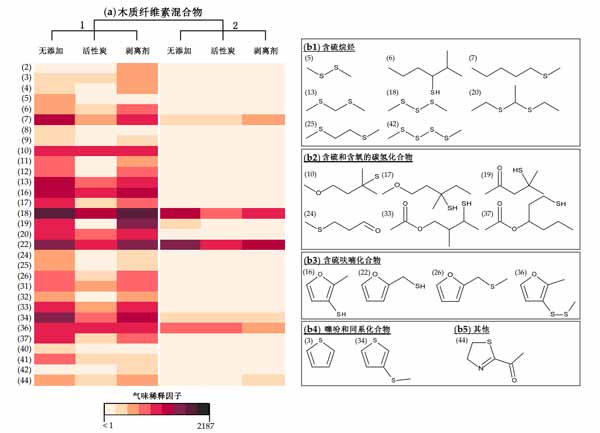 圖2:(a)在未處理和處理過的兩種木質(zhì)素混合物中檢測(cè)到的含硫氣味劑氣味稀釋因子的彩色差異和(b1-b5)硫氣味劑的結(jié)構(gòu)式根據(jù)其化學(xué)結(jié)構(gòu)分為亞組數(shù)字(2-44)是指氣味的連續(xù)順序。