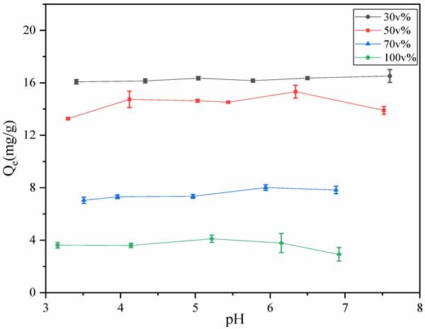圖1:溶液pH對鄰苯二甲酸二丁酯吸附能力的影響。本文圖例中的每個體積分數為乙醇含量。