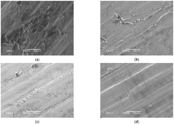 通過觀察摩擦學測試的結(jié)果,很明顯平均磨痕直徑和質(zhì)量損失的減少結(jié)果具有相似的趨勢。然而,當將活性炭添加到潤滑脂中時,質(zhì)量損失值顯示出更陡峭的趨勢。為了進一步了解質(zhì)量損失結(jié)果以及表面的磨痕形貌,應用了與能量色散X射線(EDX)系統(tǒng)集成的SEM。測試氣缸磨痕的EDX光譜是針對放大500倍的SEM圖像確定的,以便從磨痕的表面軌跡中獲得關(guān)于接觸表面上的摩擦膜的沉淀元素(碳和氧)的必要信息。圖3顯示了以500倍放大倍率成像時的磨損表面形態(tài)。在具有粗糙表面形態(tài)的商業(yè)油脂樣品的情況下,圖像描繪了淺槽和深槽(圖3a)。另一方面,活性炭樣品和2wt.%其他樣品的磨損表面(圖3b,c)顯示出淺槽,帶有少量深槽點和光滑的形貌,而在0.5wt.%活性炭+2wt.%其他樣品的混合樣品僅顯示出薄槽(圖3d)。