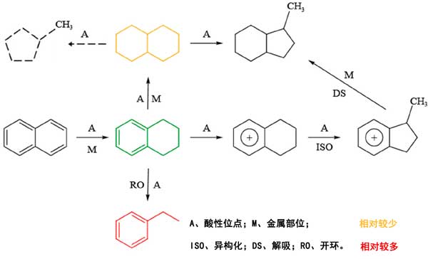 萘在改性活性炭催化劑上的加氫路徑如圖4所示。與氧化鋁催化劑上的類似,活性炭催化劑上的萘在酸性位點和MoS2的共同作用下可以生成四氫化萘和十氫化萘。四氫化萘在酸性位點與烷基苯形成碳鎓離子,然后異構(gòu)化為甲基-茚碳正離子,最后在活性位點解吸成1-甲基-茚滿。同時,四氫化萘在酸性位點受到溢氫作用時,苯環(huán)的α位和γ位斷裂,生成乙苯。通過從酸性位點上的MoS2活性位點溢出氫氣,萘烷進(jìn)一步加氫裂化為1-甲基-茚滿。與氧化鋁催化劑相比,活性炭催化劑產(chǎn)生更多的四氫化萘和更少的萘烷,這是因為活性炭催化劑比氧化鋁具有更少的酸位。