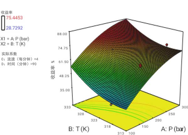 在本節(jié)中,使用三維圖檢查了不同操作參數(shù)對活性炭超臨界再生的影響,而其他變量保持在其各自固定的中間水平(壓力,200bar,溫度45℃,流速,4g/分鐘和時(shí)間90分鐘),對應(yīng)于零代碼。圖2顯示了壓力和溫度影響的3D圖。可以觀察到,再生產(chǎn)率隨著壓力和溫度分別從100bar增加到300bar和從40增加到60℃而增加;谥行膹(fù)合設(shè)計(jì),壓力對再生產(chǎn)率的影響最重要。特別是,壓力的增加導(dǎo)致CO2的溶解能力增加,因此溶質(zhì)的溶解度也增加。另一方面,溫度的升高對再生產(chǎn)量有輕微的積極影響。在100~300bar的壓力下,隨著溫度的升高,溶質(zhì)的溶解度增加,這是由于溶質(zhì)蒸氣壓增加的作用。因此,溶質(zhì)的溶解度隨著溫度的升高而增加。另一方面,提取物蒸氣壓隨著溫度升高而升高,這導(dǎo)致超臨界流體擴(kuò)散率增強(qiáng)。