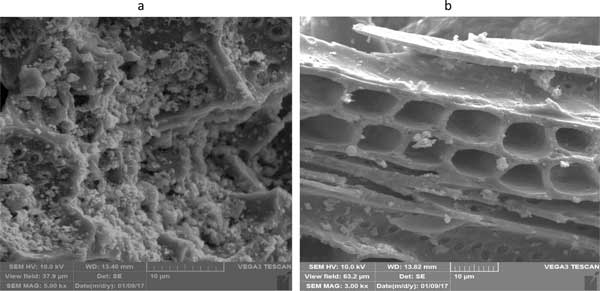 如前所述,通過掃描電子顯微鏡(SEM)評估了未提取和提取的活性炭樣品的結(jié)構(gòu)和表面形態(tài)。圖3a、b顯示了活性炭在超臨界再生之前(a)和之后(b)的兩張顯微照片。未處理樣品的顯微照片顯示不均勻且粗糙的表面均勻覆蓋有一層溶質(zhì)。由于用超臨界二氧化碳萃取獲得的高回收效率,處理過的樣品的結(jié)構(gòu)更加多孔,表面明顯收縮并耗盡溶質(zhì)。