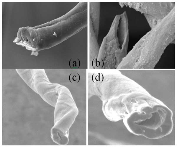 通過煅燒和HNO3、H2O2和KOH活化,廢棉纖維成功轉化為不同結構的活性炭。圖1顯示了三種活性炭的SEM圖像?梢钥闯觯瘜W活化有助于大孔隙的形成。在整個纖維長度上可以觀察到一個空心芯,直徑約為0.5–5.0µM,形狀幾乎為圓形;钚蕴烤哂懈叨榷嗫椎慕Y構,核心直徑在大約0.5和5μM之間(圖1b,d)。這種大孔隙率可能與纖維內壁木質素的化學破壞有關。參考活性炭(圖1a)呈現(xiàn)大孔隙,而形態(tài)特征是纖維中芯的出現(xiàn),其直徑取決于活化劑。使用過氧化氫作為活化試劑獲得最大直徑(圖1b)。如圖1b-d所示,前體的結構(最初具有干凈的表面)在每次化學處理后都會被破壞。有趣的是,其中一種活性炭的表面在化學活化的影響下發(fā)生明顯變化(與其他活性炭相比)。