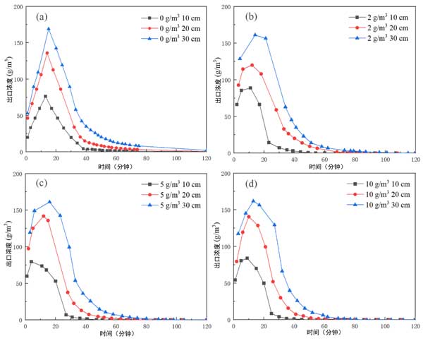 圖3:具有不同背景濃度的每個床出口的甲苯氣體出口濃度曲線。(a)0g/m3,(b)2g/m3,(c)5g/m3,(d)10g/m3。