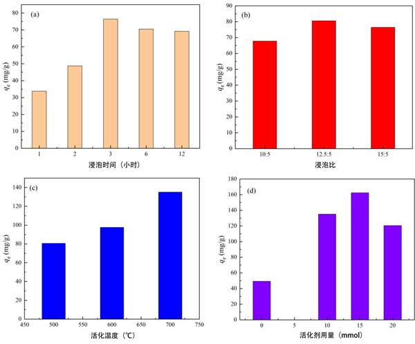 圖2:不同制備條件下改性活性炭對(duì)La3+的吸附性能。(a)浸泡時(shí)間;(b)浸泡比例;(c)活化溫度;(d)Na2EDTA用量。