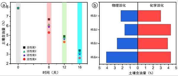 通過吸附實(shí)驗(yàn)研究了活性炭樣品在污染土壤修復(fù)中的潛在用途。對(duì)活性炭對(duì)汽油、煤油和柴油的吸附能力進(jìn)行了評(píng)估。在所有樣品中,活性炭1的吸附能力最高:汽油為9.3g/g,煤油為9.0g/g,柴油為10.1g/g。這些優(yōu)異的結(jié)果歸功于活性炭發(fā)達(dá)的微孔和中孔結(jié)構(gòu),氮吸附/解吸等溫線就是明證。相比之下,活性炭2的吸附能力中等,石油產(chǎn)品平均為7.0g/g,而其他的吸附能力較低,范圍為4.5至5.1g/g。所有樣品中柴油的吸附量均高于汽油和煤油,這可能是由于柴油的粘度較高,從而增強(qiáng)了其與碳表面的相互作用。為了在實(shí)際條件下驗(yàn)證結(jié)果,將活性炭引入受油污染的土壤中,并在處理后8至16天內(nèi)定期采集樣品,以使用重量法估算油含量。圖2a顯示了土壤樣品中的初始和后續(xù)油含量。
