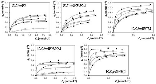 得到的結(jié)果表明,活性炭的不同的吸附能力與IL的性質(zhì)和溶液中的鹽量有關(guān)。一般而言,對于咪唑鎓的ILs,陰離子對其對活性炭的吸附能力的影響按照以下順序:Cl - ≈[CH 3 SO] <[CF 3 SO 3 ] -<[NTf 2 ] 。這一趨勢的結(jié)果和預計的相符合,并且表明,隨著陰離子疏水性的增加,活性炭對ILs的吸附逐漸增加。另一方面,考慮到IL陽離子家族,活性炭能吸附更多的吡啶鎓比基于咪唑類的對應物。總之,這里證明,如果伴隨使用無機鹽來促進鹽析現(xiàn)象并增強隔離度,則活性炭也可以用作水介質(zhì)中低濃度存在的親水性IL的有效吸附劑。得到的結(jié)果表明, 在鹽的存在下,親水性ILs的例如[C 4 C 1 im] Cl和[C 4 C 1 im] [CH 3 SO3 ]的K d值增加高達5.5倍。這種新方法可以被設想為減少由使用IL的工業(yè)過程產(chǎn)生的含水物流污染的有希望的途徑。