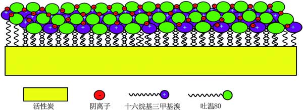 用表面活性劑改性的活性炭在電吸附過(guò)程中具有潛在的應(yīng)用,其中表面電荷和潤(rùn)濕性起重要作用。用離子表面活性劑功能化的活性炭電極最近在電容去離子技術(shù),特別是反向電容去離子系統(tǒng)中引起了相當(dāng)大的關(guān)注。圖3表明在用吐溫80和HDTMA的二元混合物改性的活性炭上吸附陰離子。吐溫80的存在表明HDTMA的吸附密度增強(qiáng),完美填充(高穩(wěn)定性),這在電吸附過(guò)程中都是值得的。實(shí)際上,HDTMA的增強(qiáng)的吸附密度誘導(dǎo)了陰離子污染物的高吸附能力。此外,改進(jìn)的填料賦予表面活性劑在表面上的穩(wěn)定性。這些特殊效果是混合表面活性劑體系應(yīng)用的最終目標(biāo)之一,為了提高活性炭的表面活性,對(duì)于單一表面活性劑體系來(lái)說(shuō),這是不可能發(fā)生的。