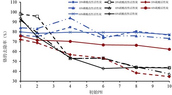 對鉻實現(xiàn)有效吸附所需的較高劑量可能意味著用硝酸,硫酸對活性炭進行化學(xué)氧化和磷酸除去吸附位點。具體地,當(dāng)考慮所用的劑量和初始濃度時,硫酸和磷酸改性產(chǎn)生的活性炭與沒改性的相比具有較差的性能。因此,基于使用不同前體的研究,不能推廣酸改性對活性炭性能的影響。對于不同濃度硫酸磷酸改性和20%硝酸改性活性炭,在pH 1下各種吸附劑的處理能力都超過75%最大的硝酸改性活性炭達到了98%,而磷酸改性活性炭的那些性能最大。總的來說,20%硝酸改性的活性炭才是去除鉻的最佳吸附劑。