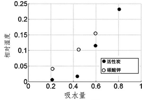 根據(jù)以前的測(cè)試結(jié)果,當(dāng)相對(duì)濕度在6至10%的范圍內(nèi)并且其在40%以上潮解時(shí),碳酸鉀在25℃開(kāi)始水合。如圖2所示活性炭載體和吸附劑在40℃下的水吸附容量;钚蕴枯d體的吸收在相對(duì)濕度為60%下急劇增加,在相對(duì)濕度為80%下達(dá)到最大23%的重量增加。在那里,吸附劑的吸收量幾乎是載體的6倍,并且最重要的是,它遠(yuǎn)遠(yuǎn)高于理論上形成碳酸鉀倍半水合物所需的量。這種顯著差異的原因是鹽在約相對(duì)濕度為43%下潮解,因此所有過(guò)量的水在載體材料的孔中冷凝,產(chǎn)生鹽的水溶液。
