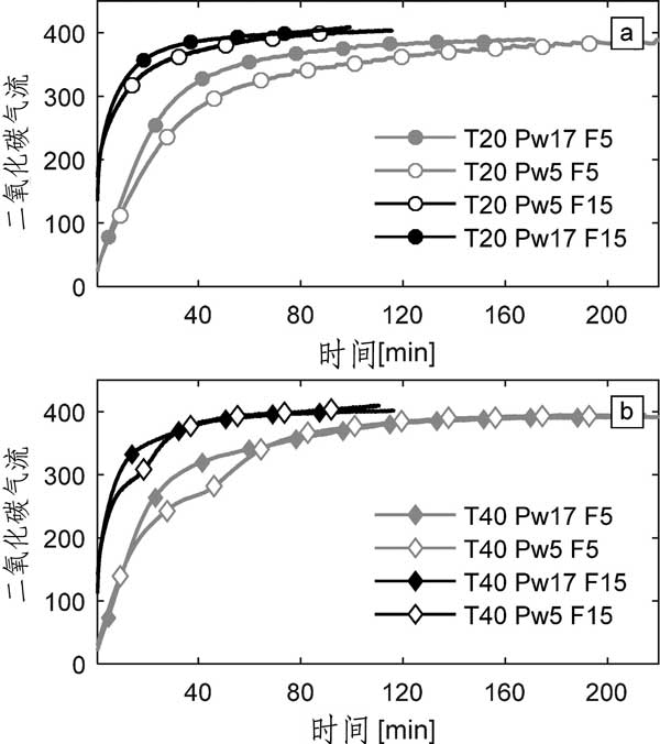 圖3:(a)20°C和(b)40°C實(shí)驗(yàn)的二氧化碳突破。