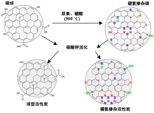 圖1:硼和氮共摻雜活性炭與碳酸鉀活化的機制。