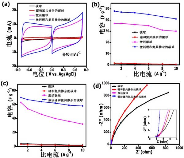 圖3顯示了在中性電解質(zhì)溶液3M KNO 3中,活性炭電極在正和負工作電位范圍內(nèi)的電化學分析結(jié)果。碳球和活性炭的相應CV曲線呈現(xiàn)出準矩形形狀,表示特征性的雙電層電容行為(圖3a)。正如預期的那樣,硼氮摻雜碳的CV曲線形狀比碳球的矩形更加矩形,因此顯示出較小的電阻碳表面。對碳球和硼氮摻雜碳觀察到的低電流響應歸因于缺乏多孔結(jié)構(gòu),限制了電極和電解質(zhì)界面之間的離子擴散和傳輸。相反,活性炭和硼氮摻雜活性炭的電流響應由于在碳表面,然后促進更好的電解質(zhì)-電極表面相互作用和增強的離子擴散進入孔隙較高。與未摻雜的碳球相比,硼氮摻雜活性炭由于其高表面積和硼氮和氧雜原子的存在而產(chǎn)生很高的電流響應。