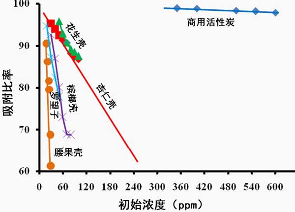 在不同的初始濃度下,對(杏仁殼,花生殼,檳榔殼,羅望子殼和腰果殼)活性炭和活性炭上的天青A染料去除程度進(jìn)行分批吸附研究,在固定劑量,在室溫(30 ± 1 °C)下接觸時(shí)間為30分鐘。隨著初始濃度的增加,所有活性炭上染料的去除率趨于降低(圖1)。這可能是由于缺乏高初始濃度的天青A所需的可用活性位點(diǎn)所致。在較低濃度的天青A大量吸附了留下更多數(shù)量的活性部位的吸附劑,在較高濃度較小數(shù)量的活性位點(diǎn)仍然可用。