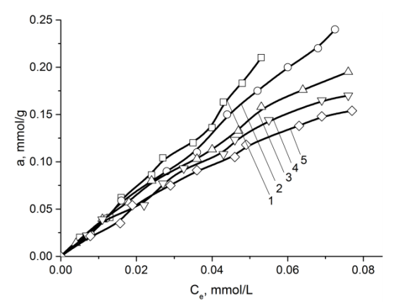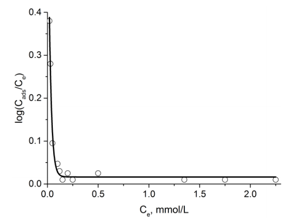圖1顯示了活性炭上鍶離子從水溶液中的吸附等溫線。如圖1所示,即使在較高的平衡濃度下,所顯示的等溫線也具有拐點。坐標中鍶離子的吸附等溫線如圖2所示。通過外推曲線,以圖形方式獲得logKads值;钚蕴康慕Y構參數(shù)由Dubinin–Radushkevich方程根據(jù)苯吸附-解吸等溫線確定。