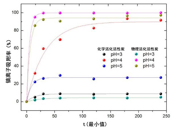 我們系統(tǒng)的研究了三種不同參數(shù)對(duì)兩種類型的活性炭吸附能力的影響:溶液的pH值,鏑離子濃度和活性炭量。