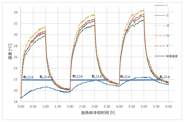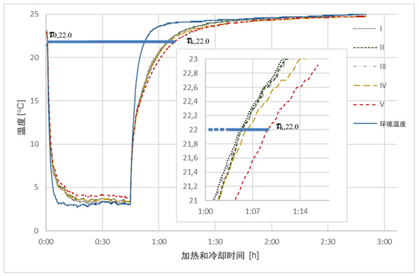 在分析曲線如圖2,圖3和圖4中,并收集結(jié)果,在一個溫度(22℃)中選擇,清楚地表明不同相變材料的影響活性炭中的量上的周期時間長度與發(fā)生個體樣品中的熱交換過程。相對于溫度傳感器的更高的質(zhì)量和熱容量,即使吸附的相變材料的量很小,也可以看到處理時間的差異。當(dāng)與參比樣品(I),沒有相變材料,總的冷卻和加熱時間的所有樣品與相變材料的不同水平長。對于樣品V,此時間延長了7.5%,對于樣品IV,延長了5.2%,對于III,延長了2.4%,對于樣品II(未活化的活性炭),僅延長了0.2%。