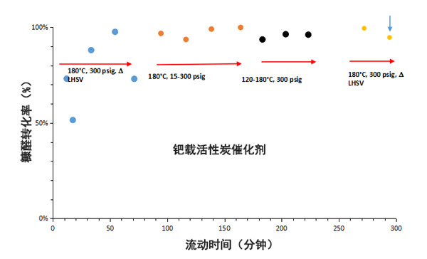 圖1:使用活性炭催化劑進(jìn)行糠醛加氫的生產(chǎn)時(shí)間分析,箭頭表示將乙酸添加到進(jìn)料中的實(shí)驗(yàn)。
