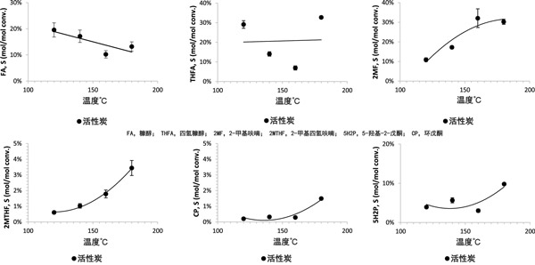 由于使用活性炭整料進(jìn)行糠醛連續(xù)氫化以合成糠醇,四氫糠醇和環(huán)戊酮的工作很少,我們希望確定溫度和壓力對(duì)選擇性和時(shí)空產(chǎn)率或轉(zhuǎn)化率的影響。因此,在一組實(shí)驗(yàn)中,采用活性炭催化劑來確定溫度對(duì)糠醛氫化的影響。在所有溫度下,活性炭整料的糠醛轉(zhuǎn)化率均高于90%;钚蕴空系母咛挤忾]率是在180°C時(shí)達(dá)到的(約90%)。升高溫度會(huì)降低糠醇的選擇性,并提高除四氫糠醇以外的所有產(chǎn)品的選擇性(圖2)。