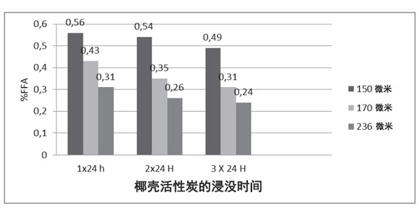 可以得出結論,使用活性炭長時間的浸泡和小的顆粒尺寸效果比較好。另外,浸漬時間,粒度和活性炭吸附劑類型對減少食用油的游離脂肪酸數(shù)量有影響。