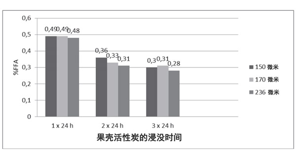 活性炭浸入進行1、2或3天。從圖中可以看出,浸泡1天的FFA值在0.4-0.5%的范圍內。浸泡兩天的FFA范圍不同(0.3-0.4%)。此外,浸泡3天的油中FFA很低,為0.2-0.3%。根據(jù)這項研究,發(fā)現(xiàn)活性炭可降低食用油的FFA。重要的是要強調指出,使用農業(yè)廢料制成活性炭來處理水性廢水(主要作為替代性吸附材料)可能是一個優(yōu)勢,因為它們可以去除廢水中的惰性污染物,并且可以很大程度地減少因不適當處理這些廢水而造成的環(huán)境影響。