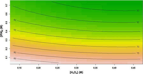 圖2顯示了總有機(jī)碳去除效率百分?jǐn)?shù)與H 2 O 2濃度和初始異丙醇濃度的關(guān)系。從響應(yīng)輪廓中可以看出,將異丙醇初始濃度從0.038 M增加到0.743 M,導(dǎo)致TOC去除率從85.17%急劇降低到46.29%?赡苁且?yàn)樵谙嗤膽?yīng)用反應(yīng)條件下,自由基(OH•)的數(shù)量保持恒定,而初始異丙醇濃度卻增加了。換句話說,相對(duì)較少量的氧化基團(tuán)可用于攻擊異丙醇分子。類似地,總有機(jī)碳降解性能也隨著H 2 O 2濃度的增加而逐漸降低。過量的H 2 O 2可能促進(jìn)自動(dòng)清除反應(yīng)的發(fā)生。