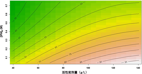 圖2:過氧化氫濃度和初始異丙醇濃度的相互作用效應(yīng)及其對(duì)總有機(jī)碳去除率的影響;钚蕴康膭┝勘3趾愣ㄔ90 g/L。