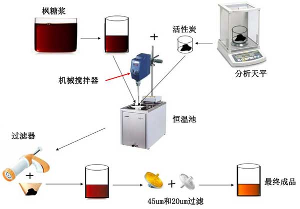 根據(jù)實(shí)驗(yàn)測試活性炭使黑楓糖漿變色的機(jī)制,使用食品級(jí)活性炭作為吸附材料,以改善深色楓糖漿的顏色和氣味/味道,從而生產(chǎn)與淡糖漿或琥珀色糖漿。圖1說明了該測試中使用的變色過程。為了進(jìn)行實(shí)驗(yàn),我們使用了不同量的活性炭(0.01、0.03和0.05 g),并引入10 mL楓糖漿樣品中,以得到0.1、0.3和0.5g/100 mL的最終濃度。然后,將混合物放入恒溫池中,以便通過使用電動(dòng)攪拌裝置來調(diào)節(jié)工作溫度和攪拌速度。攪拌(混合)時(shí)間設(shè)置為20、40和60分鐘。在混合時(shí)間結(jié)束時(shí),首先通過使用簡單的紙過濾器過濾混合物,以去除使用過的活性炭的大顆粒。通過使用兩個(gè)分別具有45和20μm的篩孔尺寸的注射器過濾器進(jìn)行第二次過濾。