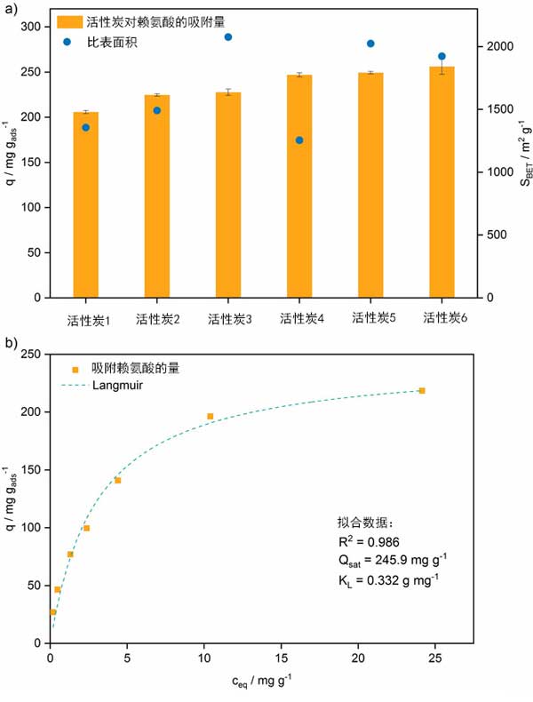圖1:a、使用具有相應(yīng)表面積的市售活性炭吸附的賴氨酸量。誤差線對應(yīng)于從三次重復(fù)實驗確定的標(biāo)準(zhǔn)偏差。b、賴氨酸在Langmuir吸附等溫線模型上的吸附等溫線。