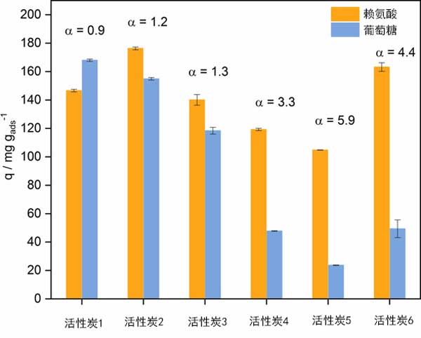 在單組分吸附中,極性最低的賴氨酸(在pH10時)的解離狀態(tài)適合在疏水性活性炭上的吸附。出人意料的是,競爭性吸附表明,親水性更高的活性炭(由較高的氧表面基團(tuán)含量引起)導(dǎo)致對賴氨酸吸附的選擇性更高。我們建議,葡萄糖(在pH10時不帶電)吸附主要依賴于基于較弱范德華力和疏水相互作用的物理吸附。由于葡萄糖和賴氨酸的極性相似,因此無法針對低功能化碳進(jìn)行基于物理吸附的分離。相反,氧官能團(tuán)含量的增加使得賴氨酸的胺基團(tuán)與活性炭的氧表面基團(tuán)之間的靜電相互作用和氫鍵增強(qiáng),從而與葡萄糖相比對賴氨酸具有更高的選擇性。為了進(jìn)一步了解賴氨酸-葡萄糖吸附對賴氨酸的高選擇性的起源并增強(qiáng)吸附性能,對活性炭進(jìn)行了系統(tǒng)地改性,以適應(yīng)表面化學(xué)性質(zhì)。