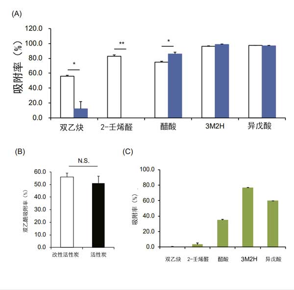我們測(cè)試了活性炭對(duì)五種散發(fā)惡臭的揮發(fā)性有機(jī)化合物的吸附能力。發(fā)現(xiàn)活性炭對(duì)二乙;2-壬烯醛的吸附水平均高于氧化鋅。但是,與醋酸氧化鋅相比,活性炭的吸附效果略低(圖3A)。相反,活性炭和氧化鋅對(duì)3M2H和異戊酸的吸附能力之間沒有顯著差異。為了比較活性炭和改性活性炭中所含活性炭的吸附能力,使用無法吸附在二氧化鈦上的二乙;鶞y(cè)試了相同量活性炭中的吸附水平。發(fā)現(xiàn)與活性炭相比,改性活性炭的吸附能力沒有顯著變化(圖3B)。
