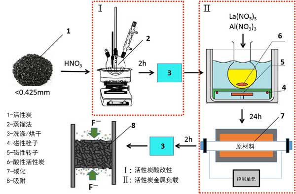 鑭鋁改性活性炭的制備包括兩個(gè)步驟:酸改性過(guò)程(I)和鑭-鋁加載過(guò)程(II)。方法I涉及特定質(zhì)量分?jǐn)?shù)的硝酸(HNO3)。將HNO3和活性炭混合在燒瓶中,將燒瓶置于75°C的恒溫水浴中保持2小時(shí)。然后,將活性炭洗滌至中性并在100℃下干燥3小時(shí),從而獲得酸改性的活性炭。用鑭(NO3)3·2H2O和鋁(NO3)3加載鑭和鋁的酸改性活性炭。將10g酸改性活性炭在100mL鑭(NO3)3·2H2O和鋁(NO3)3的混合溶液中攪拌24小時(shí)。然后,將固體產(chǎn)物在氮?dú)庀掠?00°C的管式爐中碳化兩小時(shí),冷卻至室溫后,完成鑭鋁改性活性炭,制備和吸附過(guò)程示意圖如圖1所示。鑭鋁改性活性炭將用作氟化物的吸附劑。