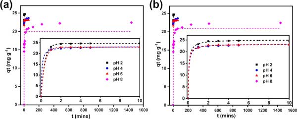 圖2:通過非線性(a)偽一階模型和(b)偽二階模型擬合在4、2、4、6和8的四個(gè)不同溶液pH下的實(shí)驗(yàn)吸附動(dòng)力學(xué)數(shù)據(jù)。實(shí)驗(yàn)數(shù)據(jù)用點(diǎn)表示,等溫線擬合用虛線表示。