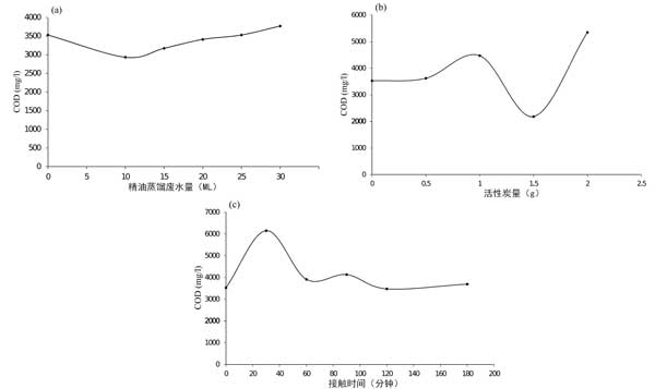 圖2:活性炭的參數(shù)對吸附COD含量的影響:(a)體積,(b)活性炭重量,(c)接觸時間。