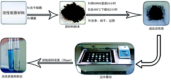 為了對(duì)廢水中的亮綠色染料進(jìn)行去除。我們進(jìn)行了間歇吸附過(guò)程,以研究實(shí)驗(yàn)參數(shù)對(duì)活性炭吸附亮綠色染料的影響,可以總結(jié)為圖1。首先,將活性炭與50mL不同濃度(10–50ppm)的亮綠色染料溶液在中性pH值下于125mL玻璃瓶中以固定溫度(25±2°C)和恒定搖動(dòng)速度。在震蕩的水浴中間隔不同的時(shí)間,直到在達(dá)到平衡。其次,使用電動(dòng)離心機(jī)將溶液離心分離,并通過(guò)分光光度計(jì)測(cè)定濾液的濃度。