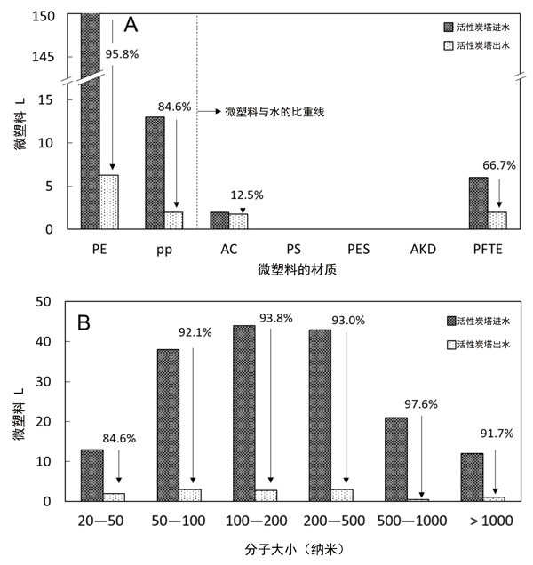 在污水處理廠的進(jìn)水和出水中觀察到未處理的污水樣品中觀察到七個(gè)不同的微塑料顆粒,包括聚乙烯(PE),聚丙烯(PP),丙烯酸酯(AC),聚苯乙烯(PS),聚酯(PES),醇酸樹脂(AKD)和聚四氟乙烯(PTFE)。PE是最豐富的MP材料類別,占MP顆?倲(shù)的72%,其次是PP(13%),AC(6%)和其他分?jǐn)?shù)相對(duì)較小的聚合物(1-4%)。假定樣品中微塑料材料類別的數(shù)量順序與原料的比重有關(guān)。具有較低比重的微塑料顆粒可以通過從污水源沉降到污水處理廠的過程中,以較低的重力進(jìn)行更有效的輸送。在中試規(guī);钚蕴垦b置的進(jìn)水和出水中觀察到的MP顆粒的數(shù)量濃度和尺寸分布分別顯示在圖2AB中。通過活性炭處理,可以顯著提高微塑料的去除率(92.9%)。特別是,發(fā)現(xiàn)活性炭處理在去除比水輕的微塑料(例如PE和PP)以及所有尺寸范圍的微塑料(包括20–50µm尺寸)方面都是有利的,而初級(jí)和生物處理很少去除這些微塑料。關(guān)于微塑料去除效率,配備活性炭過濾系統(tǒng)的飲用水處理廠獲得了類似的結(jié)果(大約89%的去除率)。